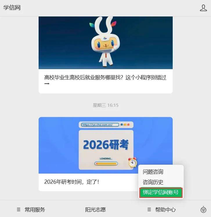 2、在“帮助中心-绑定学信网账号”菜单栏里,点击进入绑定页面,如下图: