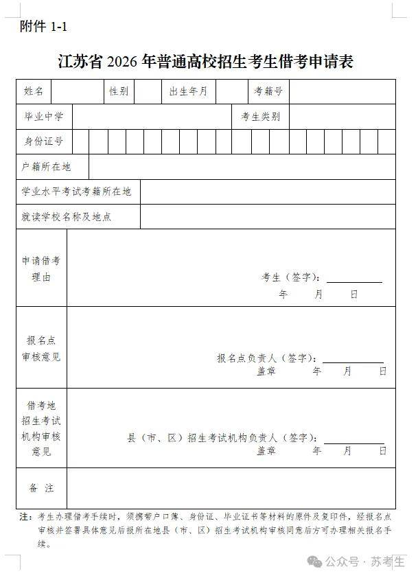 江苏省2026年普通高校招生考生借考申请表