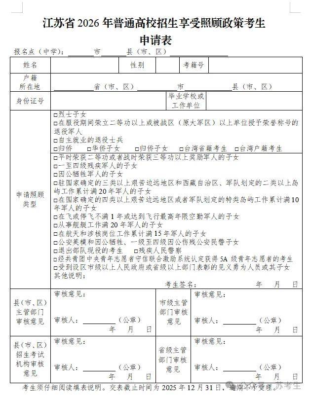 三、符合照顾政策的考生须认真填写《江苏省2026年普通高校招生享受照顾政策考生申请表》(附后),按填表说明规定的流程完成相应职能部门资格审核,于2025年12月31日前连同相关证明材料交高考报名点。申请表仅做信息采集使用,考生录取时可享受的照顾政策,以我省2026年招生政策为准。教育部有新规定的,按新规定执行。