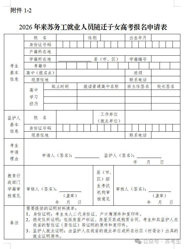 4.随迁子女考生还须提交《2026年来苏务工就业人员随迁子女高考报名申请表》(附件1-2)及以下证明材料,由就读中学汇总后报教育行政部门和县(市、区)招生考试机构审核。
