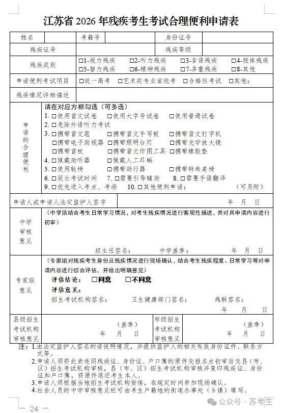 江苏省2026年残疾考生考试合理便利申请表