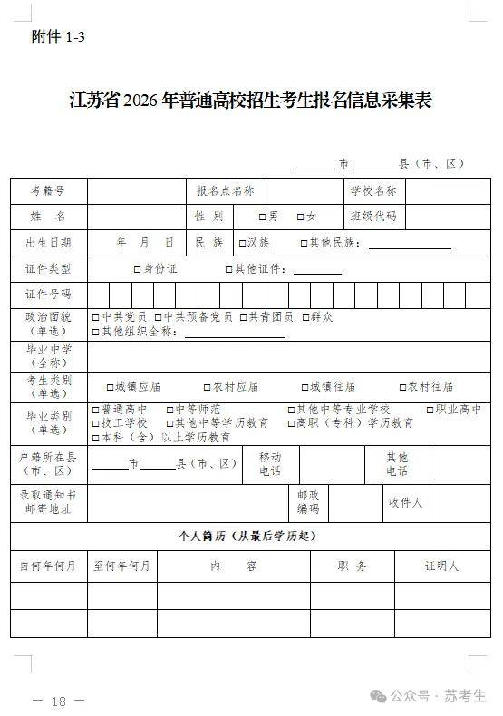 江苏省2026年普通高校招生考生报名信息采集表