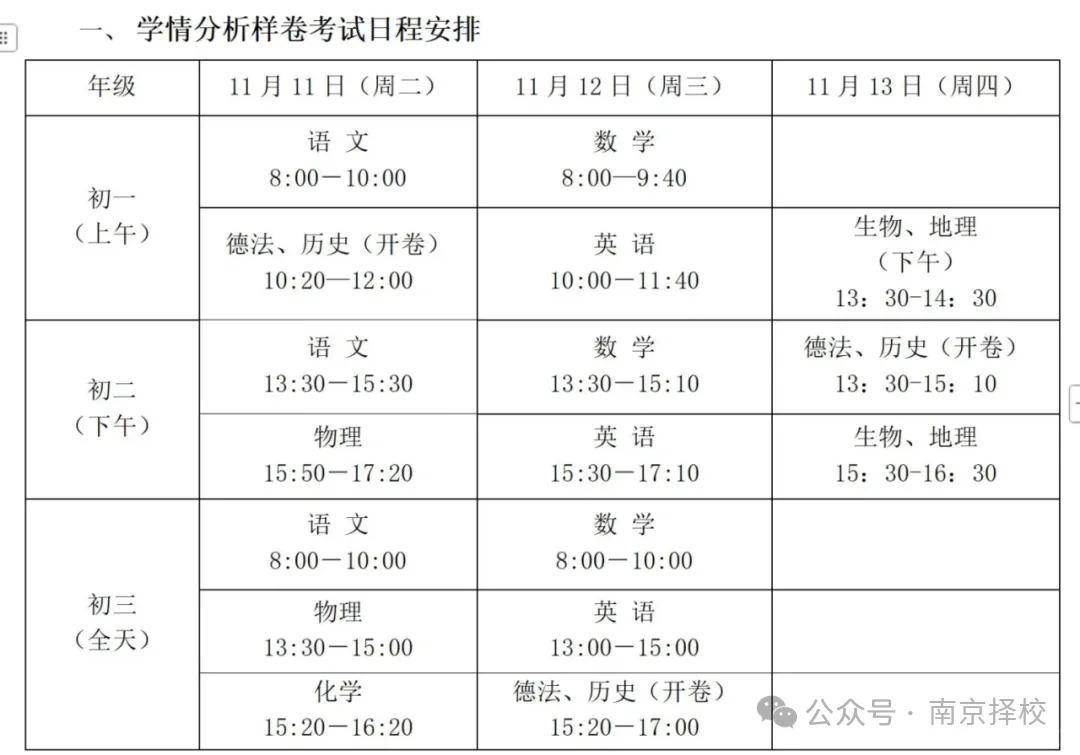 据家长透露,初一至初三,全区统考,开考时间为11月10日上午8点。