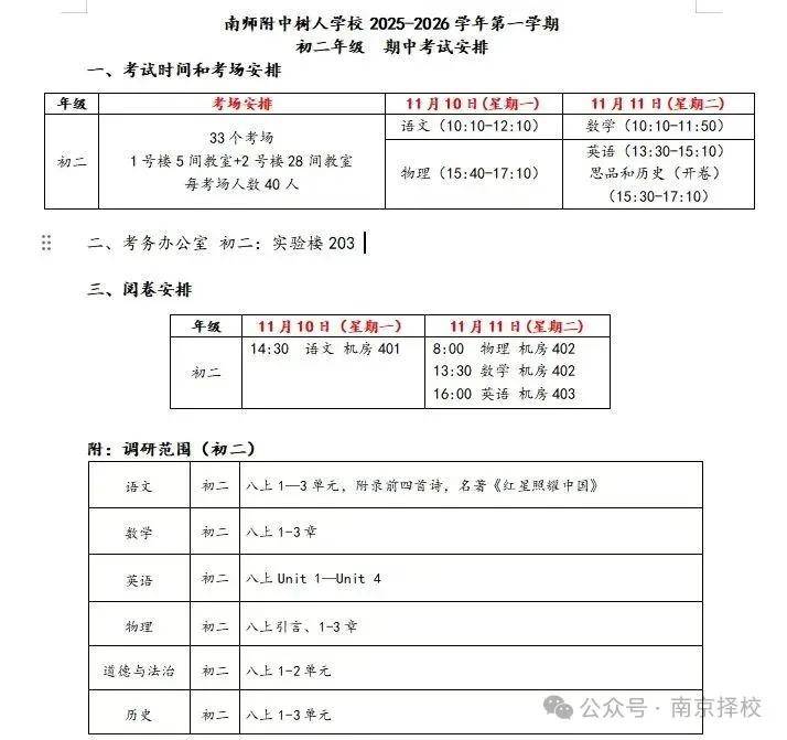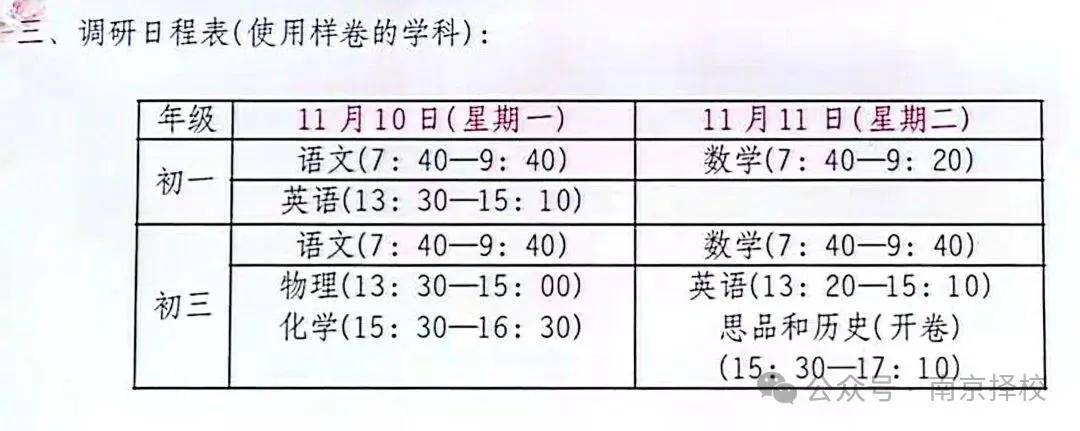 初一初三全区统考,时间安排在11月10日-11日,具体安排如下: