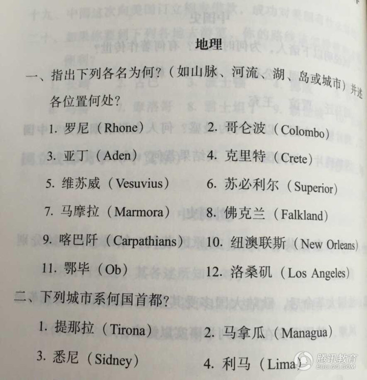 民国老试卷中的地理题目,那时候的纽澳联斯,现在换了个洋气的名字,叫新奥尔良。