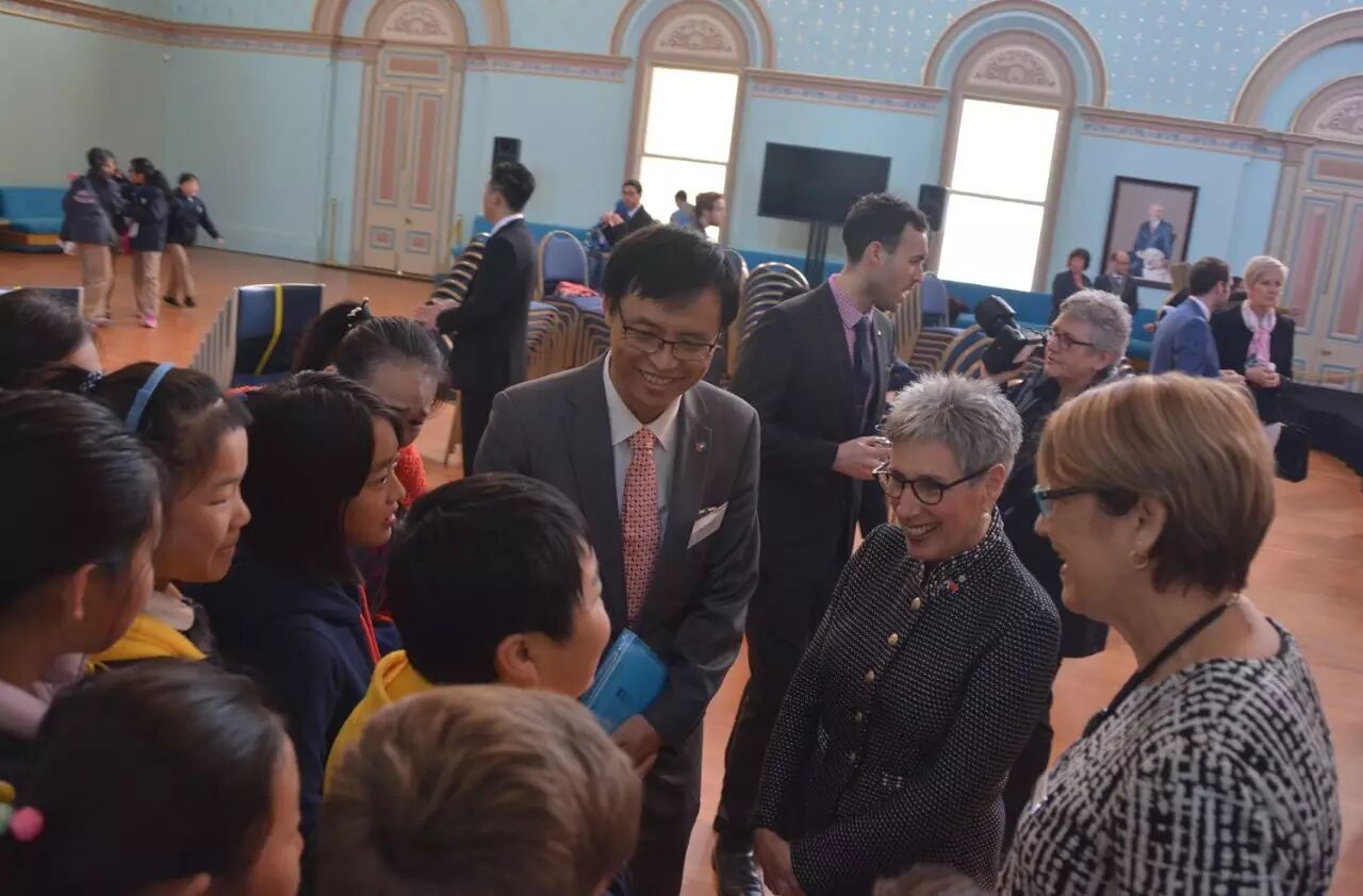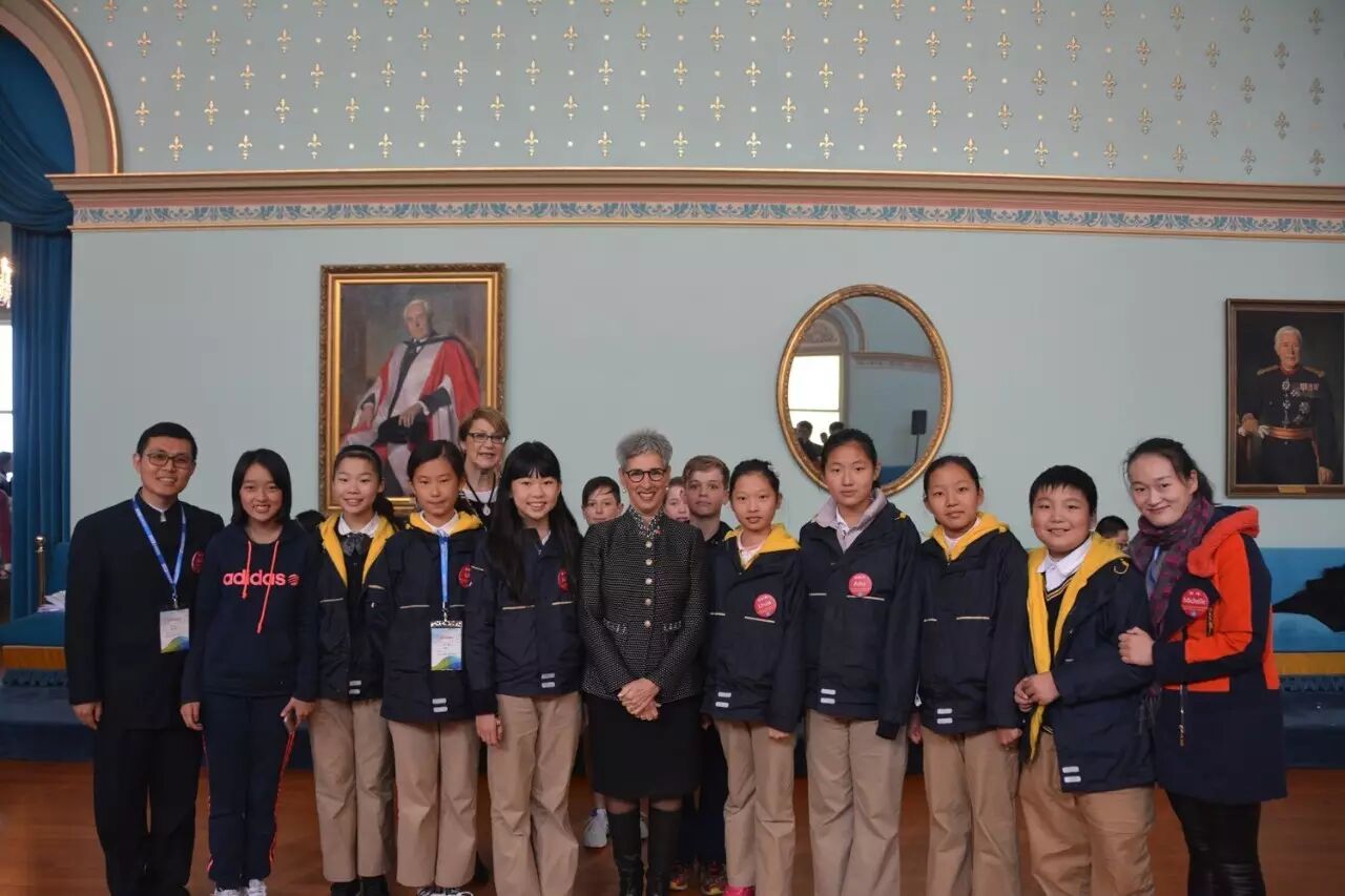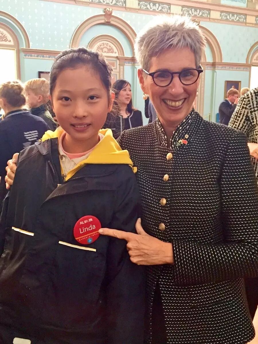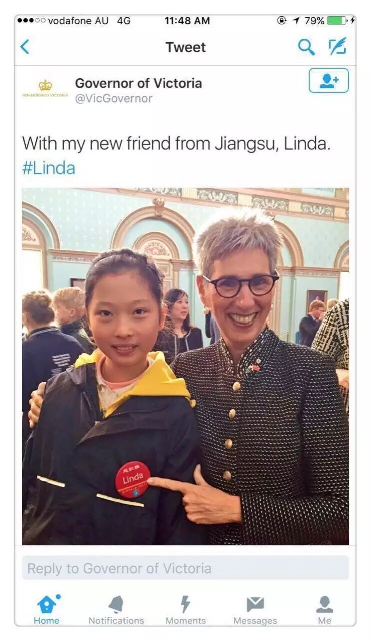 修学旅游期间,澳大利亚维洲为访澳修学全体团员举行了隆重的欢迎仪式。在金碧辉煌的总督府,总督夫人致欢迎辞,欢迎所有赴澳修学旅行的老师和同学。会后总督夫人还和一附小集团师生进行了亲切的交流,当得知赵歆雅同学的英文名和她一样叫Linda时,总督夫人主动要求和师生们合影留念,当天下午就在总督府的Twitter上登出了这张照片:女孩是一附小的赵歆雅,英文名叫Linda,和总督的名字一样,所以特意刊登这张照片,标题是“With my newfriend from Jiangsu”。