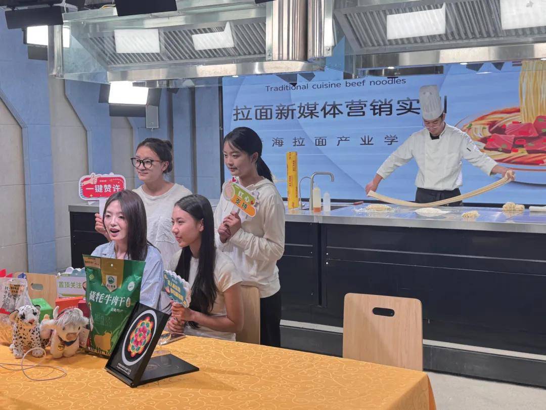 图为青海高等职业技术学院青海拉面现代产业学院学生进行拉面技艺展示与青海特色产品直播带货