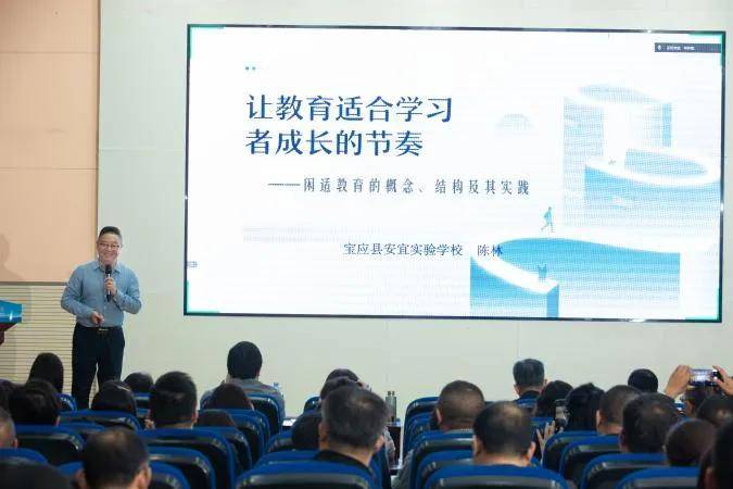 10月15日,宝应县安宜实验学校陈林老师作了题为《让教育适合学习者成长的节奏——闲适教育的概念、结构及其实践》的主旨报告。他围绕“闲适教育的必然性”“概念与结构”“实践路径”与“保障机制”四个维度,系统阐释了自己的教育主张,重点分享了学校为践行此理念所做的系统性规划,通过生动的“落地现场”展示,使“闲适教育”从理论构想走向了成体系的办学实践,为“让教育适合学生”提供了清晰的区域样本。团队成员祁华梅、潘静老师随后分别以《“宜”课堂,以闲适姿态促进学科育人》《习荷实践,闲适正心》为题进行了实践成果展示。