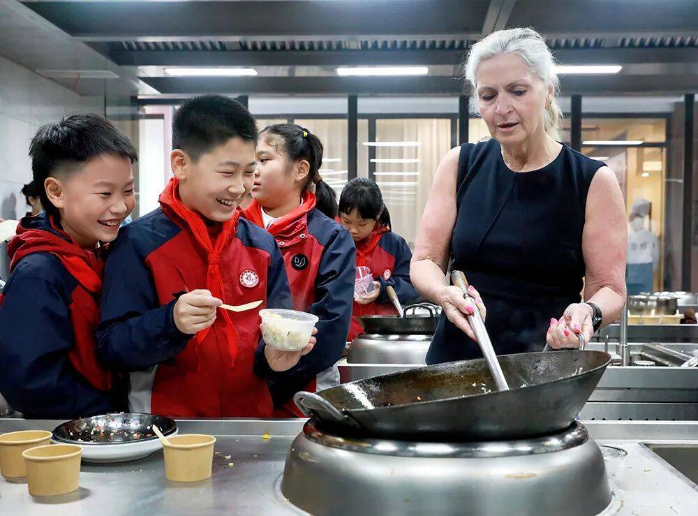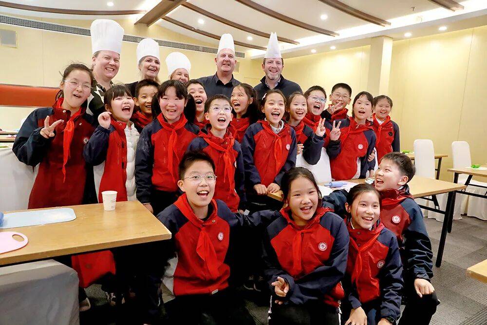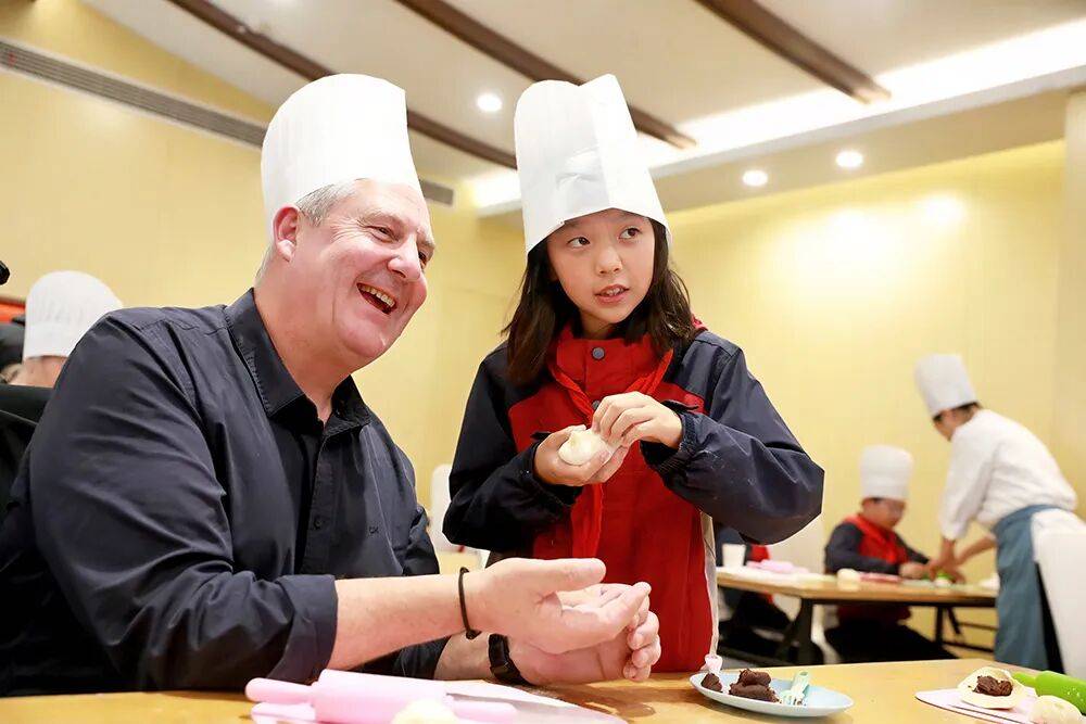 在扬州市育才小学,澳大利亚6名小学校长与五年级学生共同走进扬州淮扬菜博物馆,开启了一场别开生面的美食文化探索之旅。中外“临时搭档”在淮扬菜大师的指导下协作制作扬州炒饭——澳方校长掌勺,学生协助,不同语言与肤色在灶台前融合,锅中翻滚的不仅是食材,更是文化与情感的传递。随后,大家共同体验了扬州包子的制作,从揉面、擀皮到捏褶,每一步都充满挑战与乐趣。校长们纷纷赞叹扬州美食“令人惊叹”,学生在协助中也自信展示出在校本课程中习得的劳动技能,现场笑声不断,友谊悄然生长。