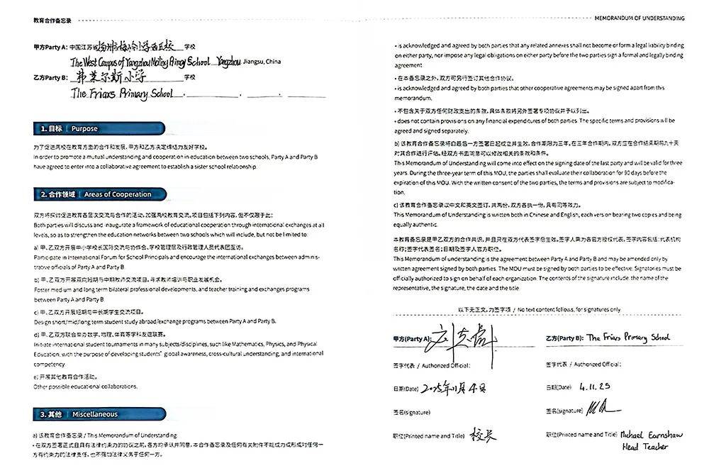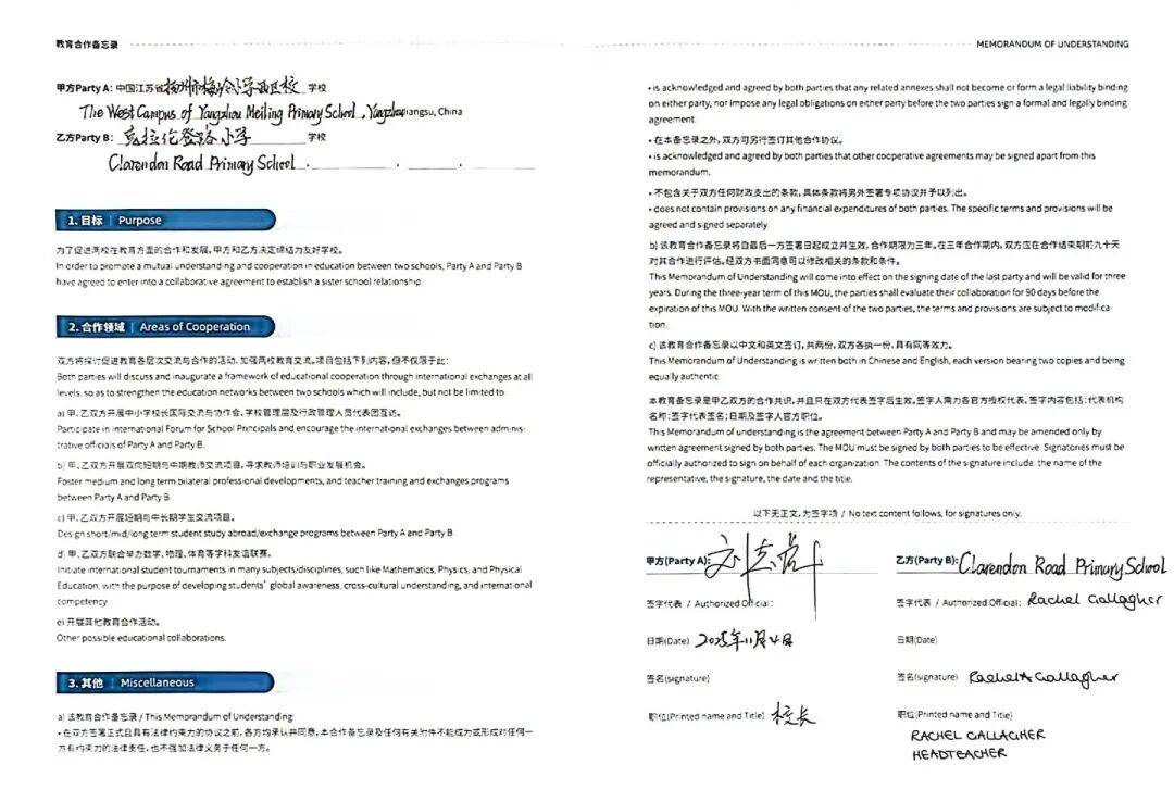 南京师范大学附属邗江实验学校与韦斯特伍德公园社区小学完成友好签约。外方代表Sara女士走进校园,近距离观看学生手工作品,体验中华传统文化并获赠书法作品。她深入二年级音乐与数学课堂,了解学校课堂范式;五年级学生则主动向她介绍班级“完美教室”特色。张义兵校长还带领嘉宾参观了校园农场,展现学校在劳动教育与校园文化建设上的积极探索。