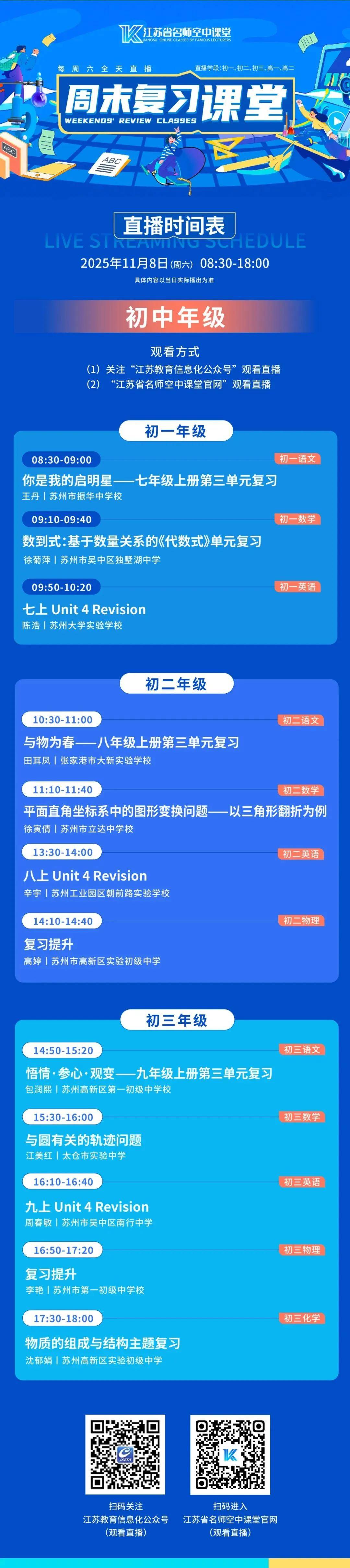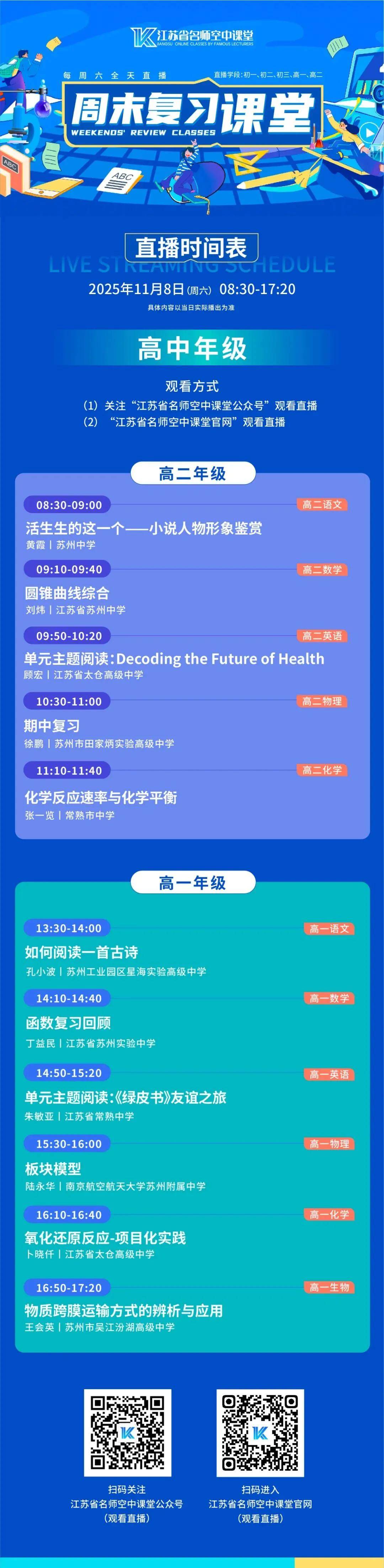 周末复习课堂,周六进行,分初中高中内容,详情见江苏省名师空中课堂。