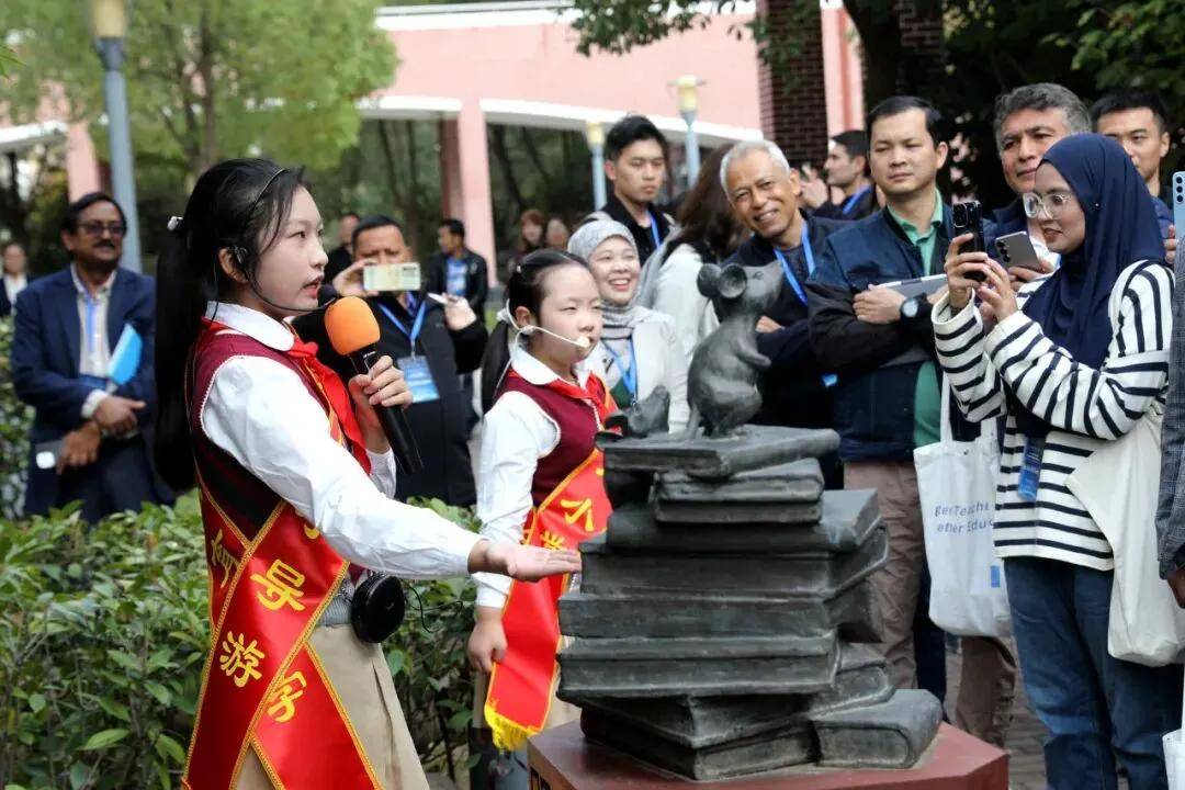 研讨班走进东洲国际学校长江路校区,开启了以“新艺术教育与社会情感学习”为主题的交流之旅。2412 班的“值日小导游”们以流利的英语,引领来宾参观“好的教育”文化中心与“美的历程”中华文明学习中心,将东方美学转化为跨文化沟通语言。