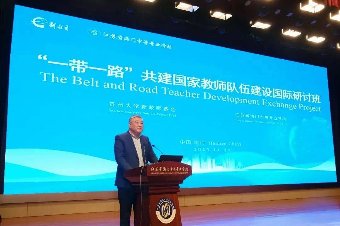 海门区教育体育局负责同志致辞,并作《深耕新教育实验 推动育人方式变革》主题报告。 此次跨越山海的教育交流,是新教育理念的生动延伸,更是文明互鉴的鲜活实践。来自“一带一路”共建国家的教育使者们通过参访,全方位了解了海门基础教育与职业教育的创新成果,感受了中华优秀传统文化的深厚底蕴。海门教育也以开放的姿态吸纳国际智慧,为推动“一带一路”教育合作、构建人类命运共同体注入蓬勃动力。未来,海门将继续深化国际教育交流,让不同文明在互鉴中携手同行,共绘教育合作的美好蓝图。