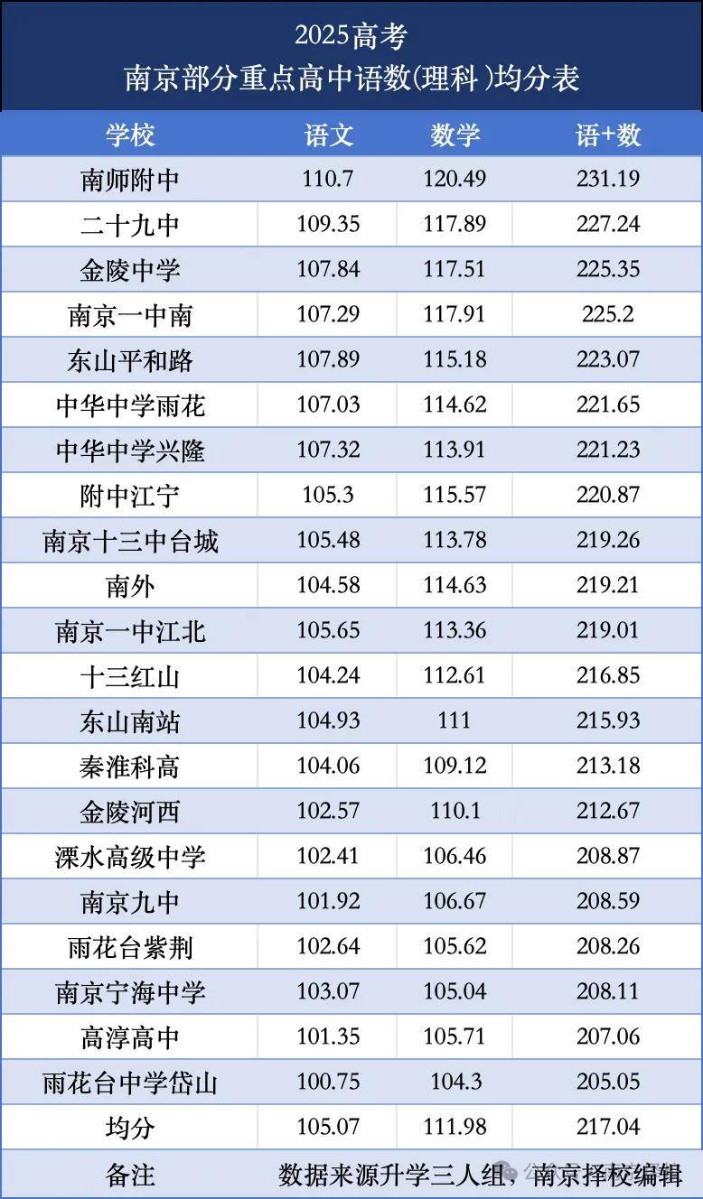 近日,有网友发布了 2025 年南京部分高中高考理科语文、数学均分及总分,信息量巨大。下面一起来看:
