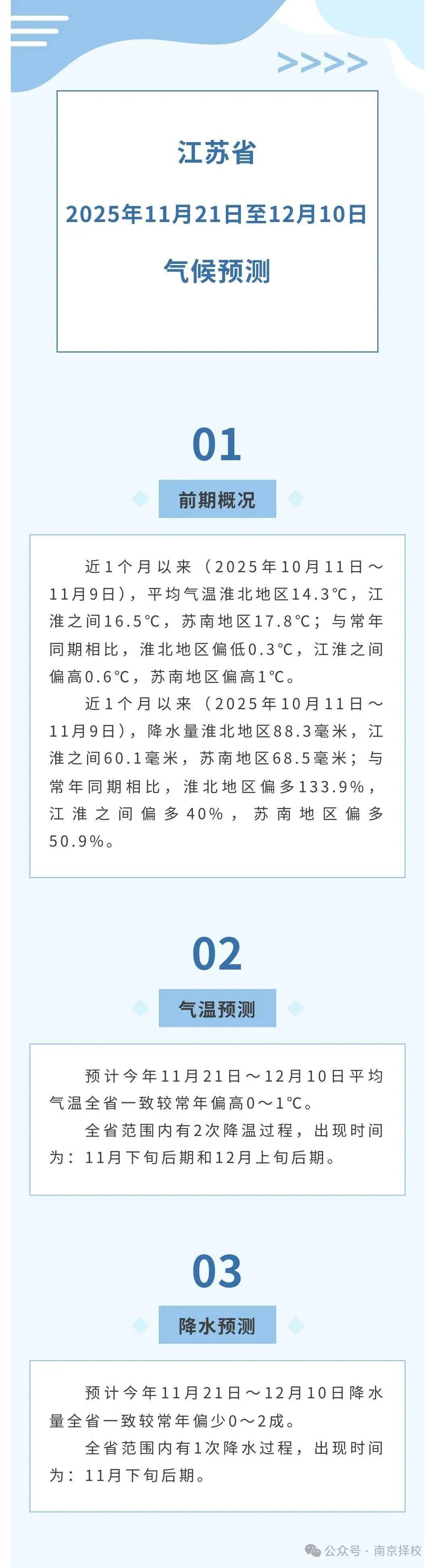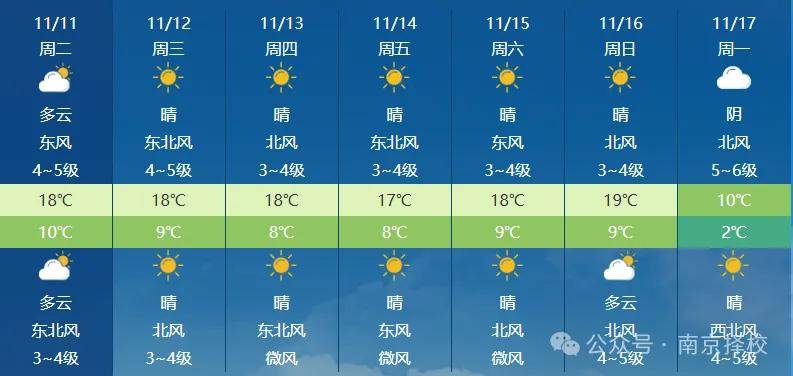 南京近多云,11月17日最低气温2℃。11月21日~12月10日江苏平均气温偏高,降水偏少。