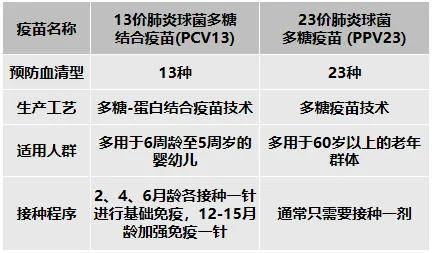 我国批准上市使用的肺炎球菌疫苗主要有13价多糖结合疫苗(PCV13)和23价多糖疫苗(PPV23)两种。两种疫苗的生产工艺和适宜接种年龄不同,具体详见下图。