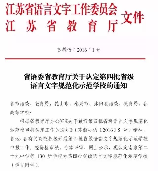 近日,江苏省语言文字工作委员会、江苏省教育厅下发了《省语委省教育厅关于认定第四批省级语言文字规范化示范学校的通知》,我市9所中小学被认定为第四批省级语言文字规范化示范学校。