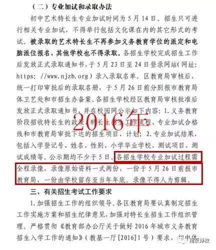 2016年政策中规定:特长生的专业加试过程需全程录像,录像原始资料一式两份,一份报市教育局,一份存档。