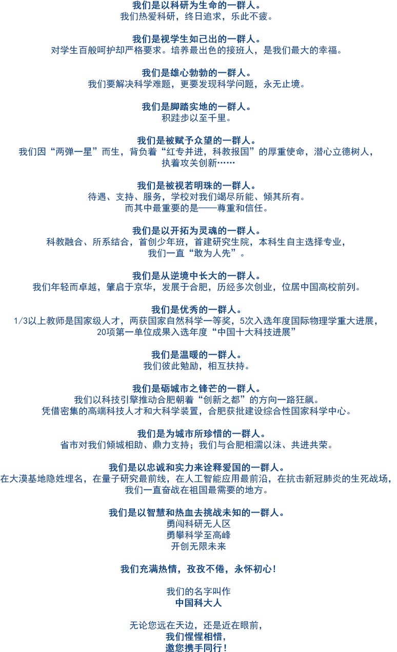 中国科大以优越的学术环境、卓越的科研平台、优异的学生质量和优厚的支持待遇,诚邀海内外英才加盟,共创事业辉煌!