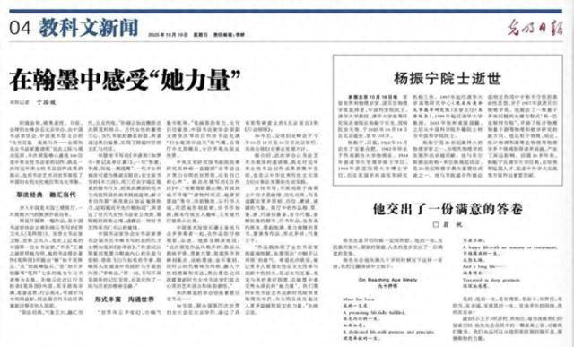 10月19日,杨振宁夫人翁帆在《光明日报》发文《他交出了一份满意的答卷》。