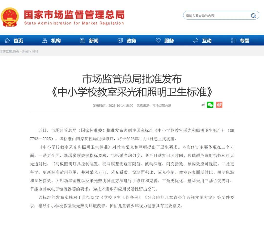 市场监管总局批准发布《中小学校教室采光和照明卫生标准》,2026年11月1日起实施。标准全面修订教室采光照明要求。
