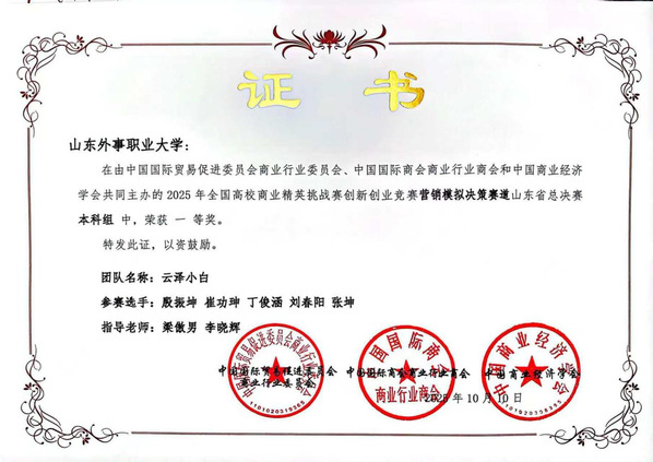 近日,2025年全国高校商业精英挑战赛创新创业竞赛营销模拟决策赛道山东省总决赛圆满落幕。山东外事职业大学学子凭借扎实的专业素养、出色的创新思维与高效的团队协作,在比赛中脱颖而出,荣获本科组一等奖2项。梁傲男、李晓辉两位指导教师荣获“优秀指导教师奖”。