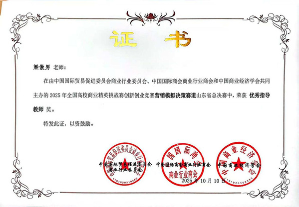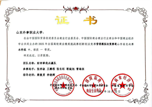 山东外事职业大学在2025年全国高校商业精英挑战赛创新创业竞赛中获两项本科组一等奖,梁傲男、李晓辉获优秀指导教师奖。