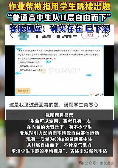 近日,有网友反映,作业帮APP上出现调侃学生跳楼自杀的题目。