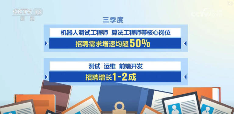 人工智能产业发展提速,高端技术领域人才缺口持续扩大。三季度,机器人调试工程师、算法工程师等核心岗位招聘需求增速均超50%,测试、运维、前端开发招聘增长一至两成。