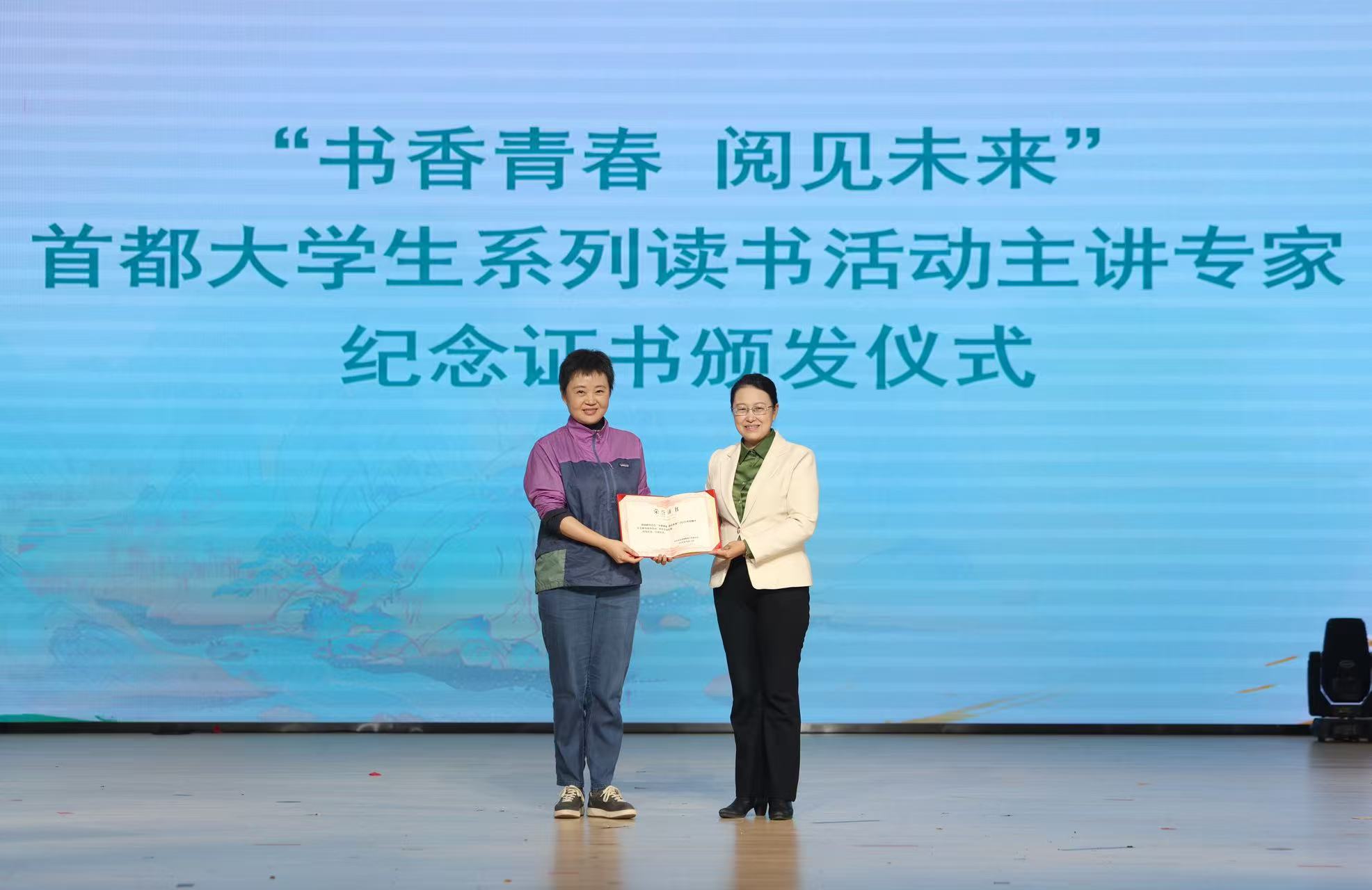 周晓枫(左)获颁主讲专家纪念证书。新京报记者王飞 摄