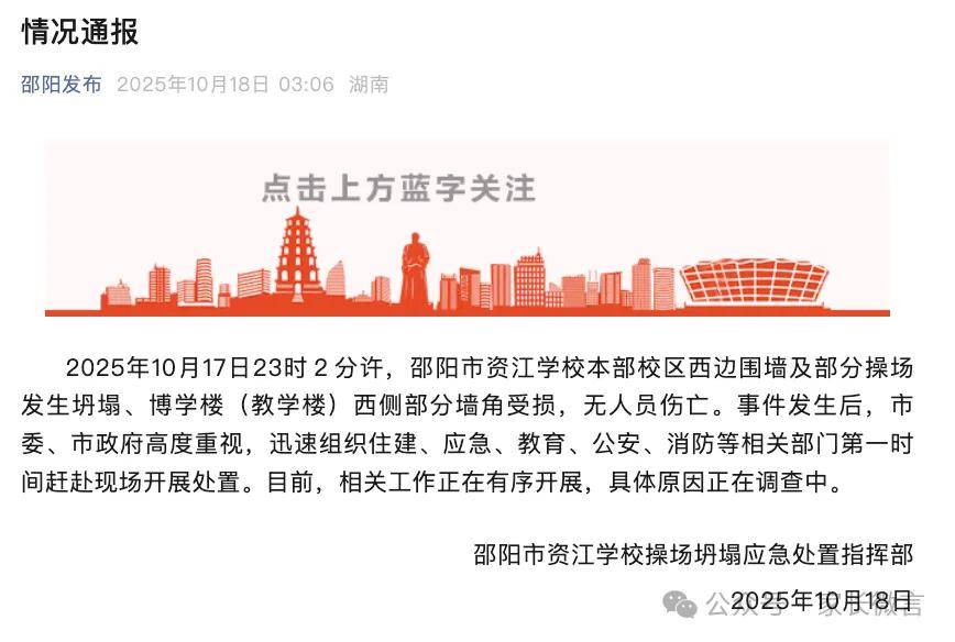 18日,“邵阳发布”公众号发布通报称,17日23时2分许,邵阳市资江学校本部校区西边围墙及部分操场发生坍塌、博学楼(教学楼)西侧部分墙角受损,无人员伤亡。事件发生后,市委、市政府高度重视,迅速组织住建、应急、教育、公安、消防等相关部门第一时间赶赴现场开展处置。目前,相关工作正在有序开展,具体原因正在调查中。