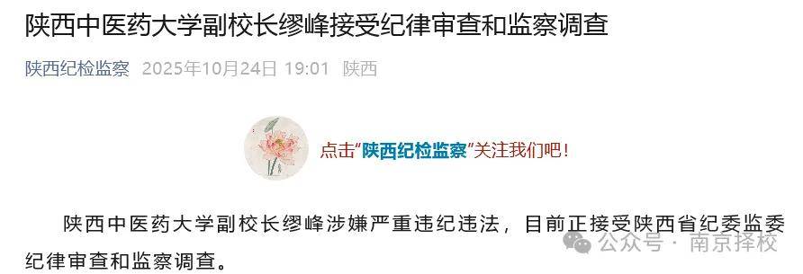 10月24日,据陕西纪检监察消息:陕西中医药大学副校长缪峰涉嫌严重违纪违法,目前正接受陕西省纪委监委纪律审查和监察调查。