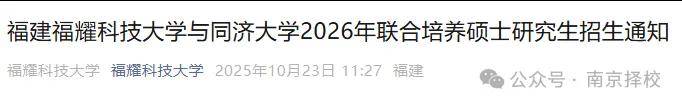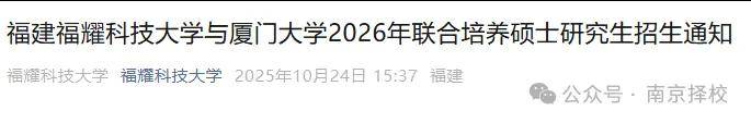 26研考报名进行时。继10月23日宣布与同济大学联合培养硕士研究生后,10月24日,福建福耀科技大学发布了与厦门大学2026年联合培养硕士研究生的招生通知。