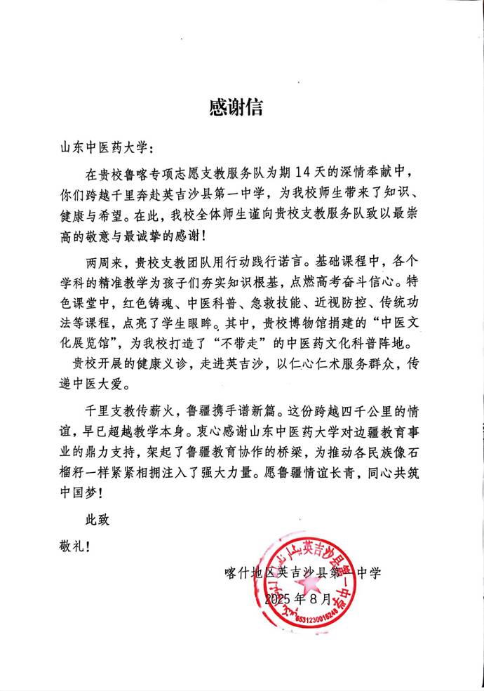 “我校全体师生谨向贵校支教服务队致以最崇高的敬意与最诚挚的感谢!”近日,山东中医药大学收到了一封跨越4000公里的感谢信。这封信来自新疆维吾尔自治区喀什地区英吉沙县第一中学,承载着边疆学校对山东中医药大学的深切情谊,成为山东中医药大学“红岐育人”理念在鲁喀大地落地生根的鲜活见证。