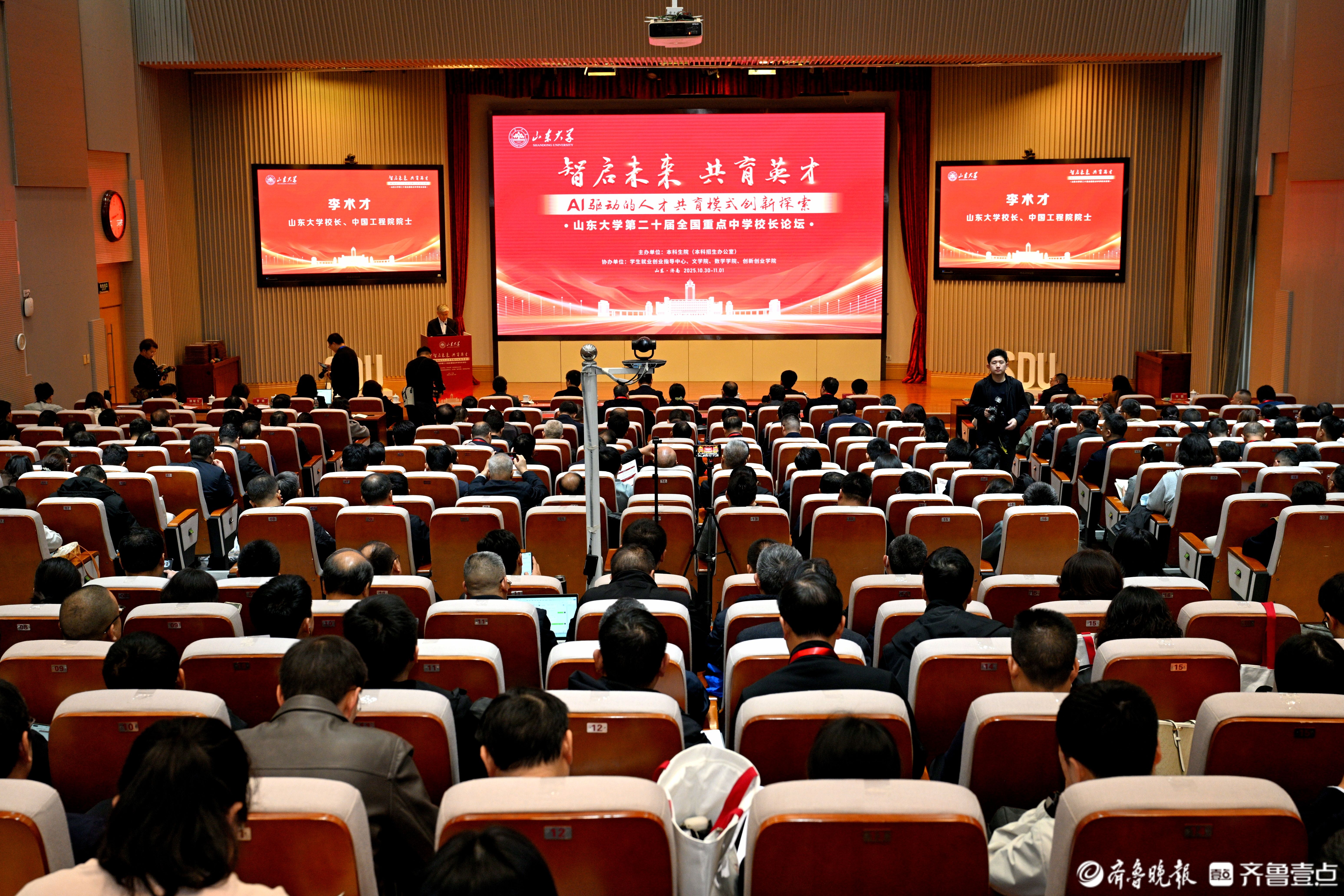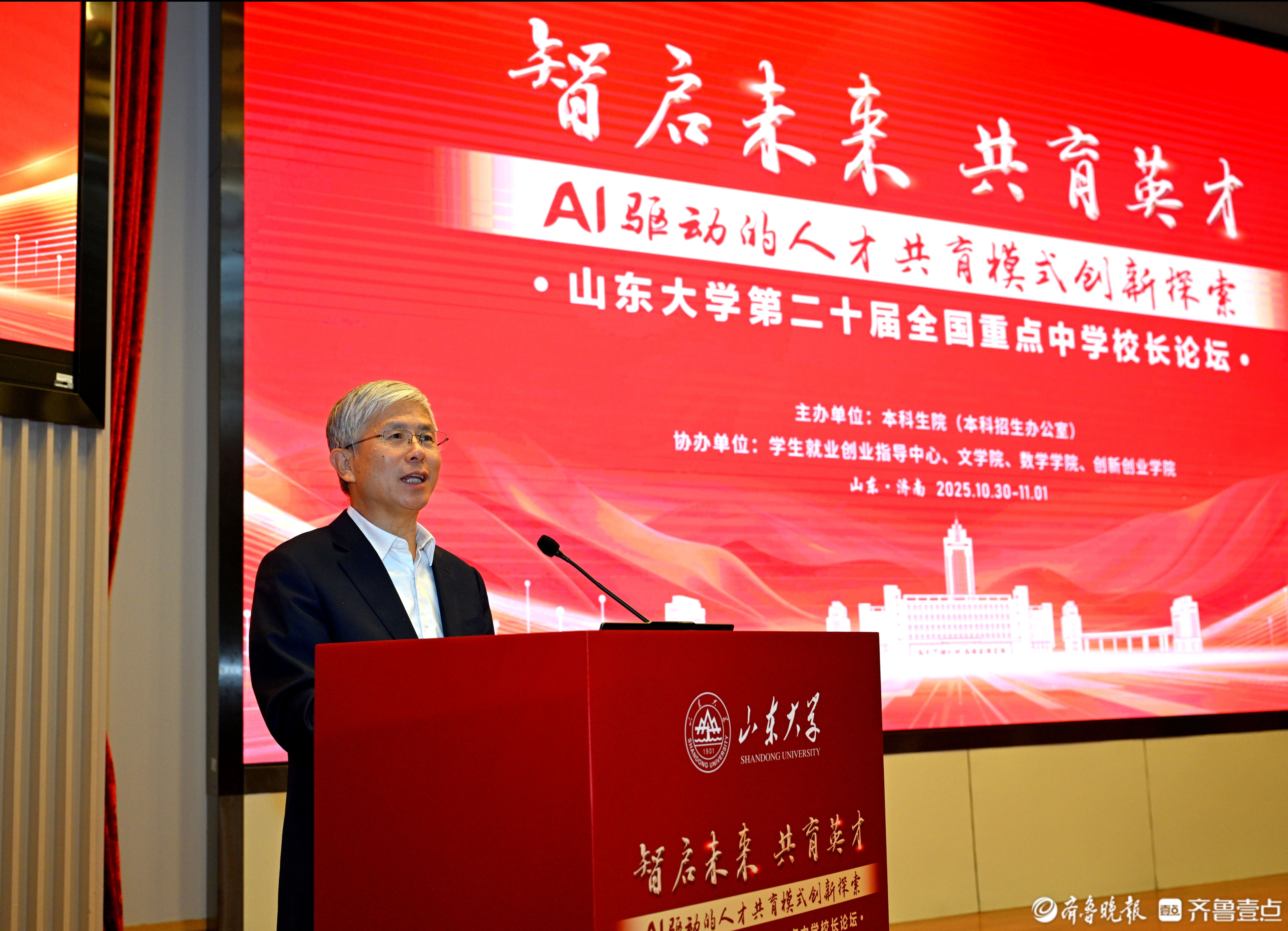 2025年10月31日,山东大学在中心校区隆重举办第二十届全国重点中学校长论坛。本次论坛以“智启未来 共育英才”为主题,聚焦人工智能驱动下的教育变革与人才培养模式创新。来自全国各地的重点中学校长、教育专家及山东大学师生代表等齐聚泉城,深入探讨新形势下大中衔接协同育人机制。论坛开幕式由山东大学党委常委、常务副校长吴臻主持。