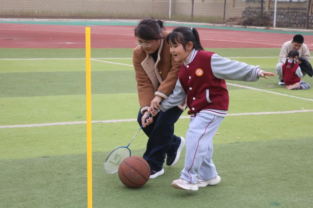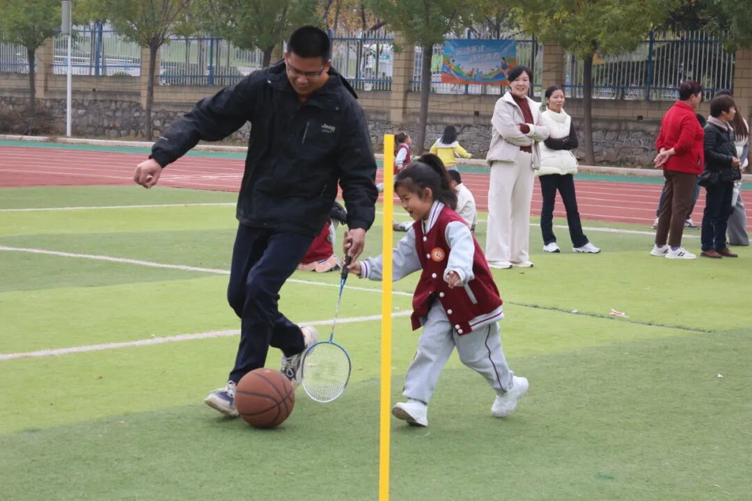 “赶鸭子”项目同样趣味十足,家长和孩子用羽毛球拍赶着篮球前进,笨拙又默契的配合让赛场充满欢声笑语。