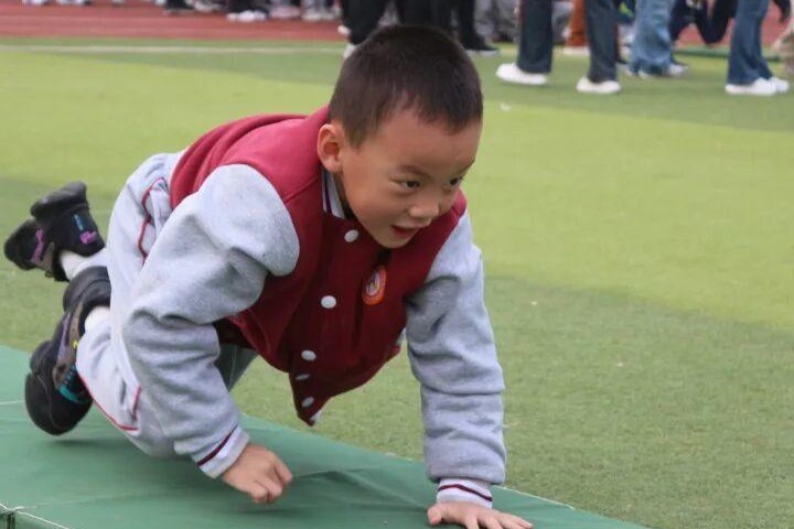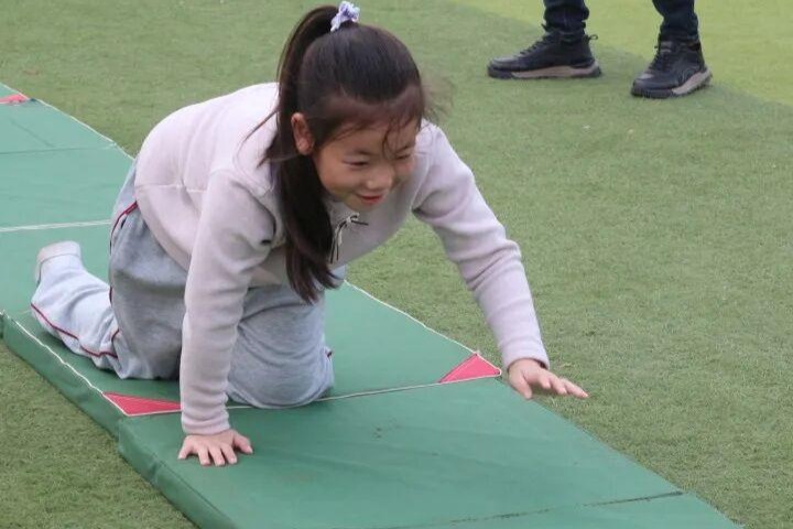 “毛毛虫接力”环节考验速度与协作,亲子趴在垫子上模拟毛毛虫“蠕动”,额角渗出汗水、膝盖沾满尘土也毫不在意,只为争夺班级荣誉。