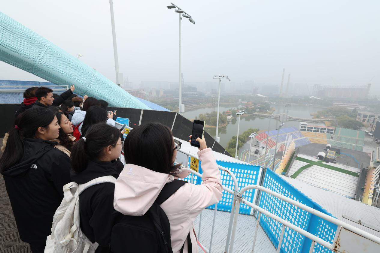 同学们在首钢滑雪大跳台合影留念。新京报记者陶冉 摄