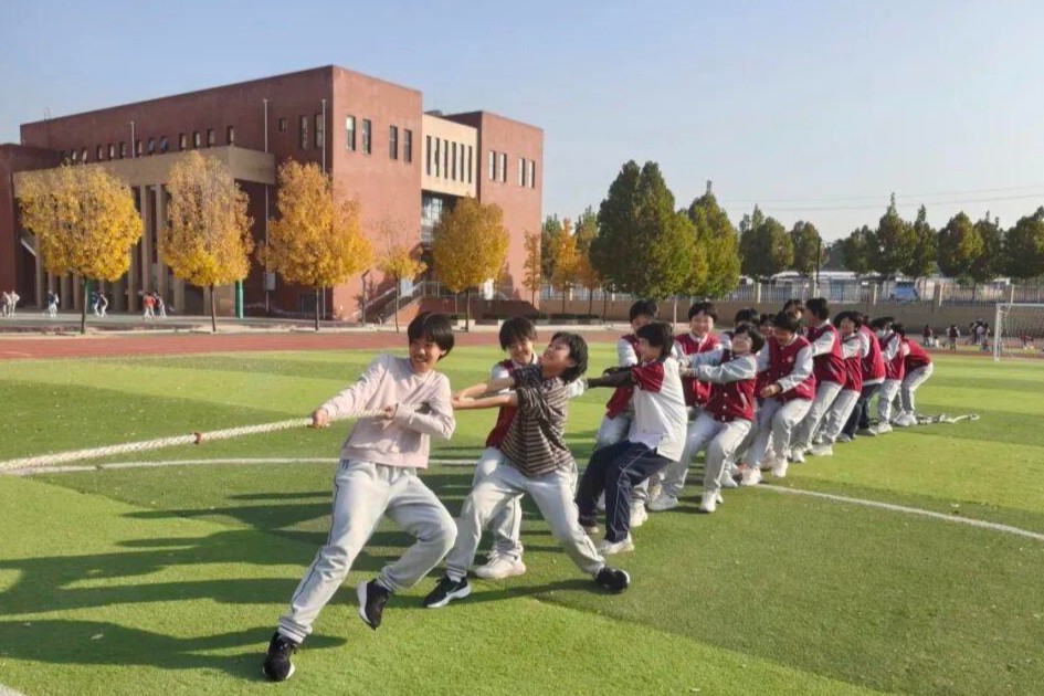 秋高气爽的校园操场成为活力主场。大课间期间,仰卧起坐、引体向上、跳远等体能训练有序开展,学生们分组练习,动作规范认真,秋风中回荡着彼此的加油声与欢笑声。随后的拔河比赛点燃全场,队员们紧握绳索、身体后倾,齐心协力向同一方向发力,在力量对抗中锻炼了体魄,更培养了团队协作与拼搏进取的精神,让青春朝气在秋日赛场充分绽放。