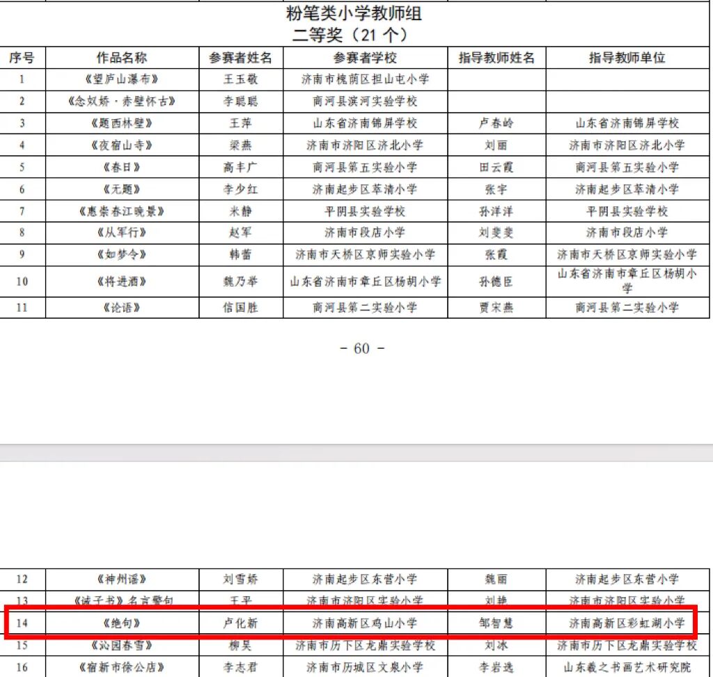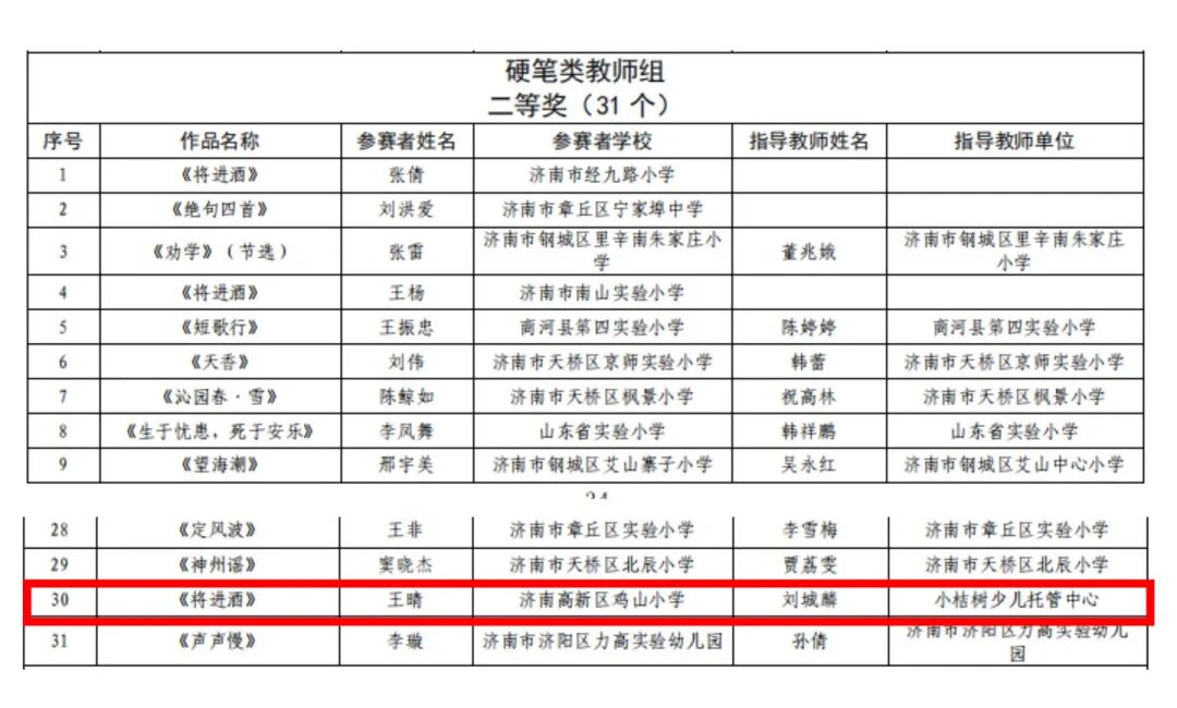 近日,由济南市教育局主办的第七届中华经典诵写讲大赛济南赛区评选结果揭晓,济南高新区鸡山小学师生表现亮眼,斩获多项荣誉。其中,学校校长卢化新荣获粉笔类教师组二等奖,教师王晴荣获硬笔类教师组二等奖,学生袁珺瑶荣获硬笔类小学生组二等奖。