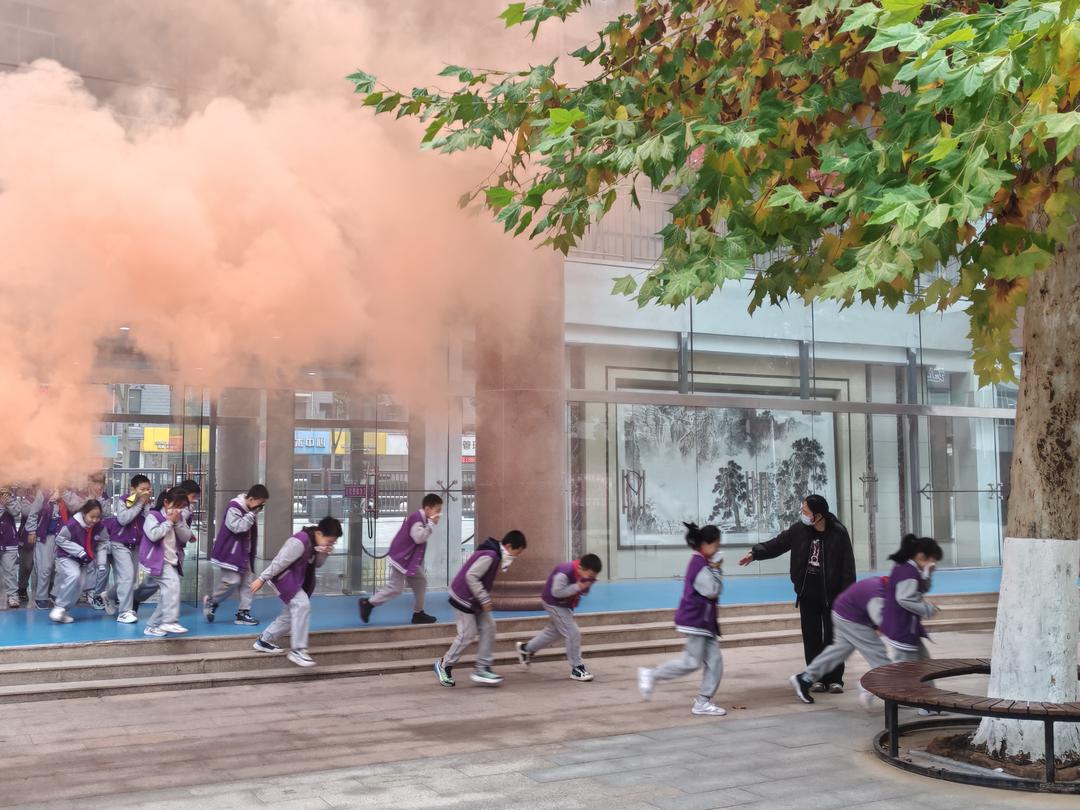 上午八点半,演练正式启动。现场总指挥发布疏散指令后,教学楼前燃起模拟火源并施放烟雾,警报声随即响起。各班学生在班主任引导下,迅速按照预定路线,以两列纵队、低姿弯腰的姿态有序撤离。师生们牢记“一瓶水一手帕”的逃生要领,用湿毛巾捂住口鼻,沿教学楼东西两侧楼梯快速疏散至操场安全区域。整个疏散过程紧张有序,各环节衔接紧密。