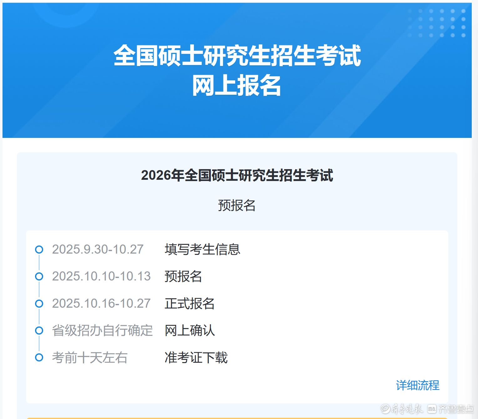 2026考研预报名开始,每日9:00—22:00,10月10日—13日,正式报名10月16日—27日。网上报名和确认,缴费有效。考试信息须核对,确认未通过无法考试。