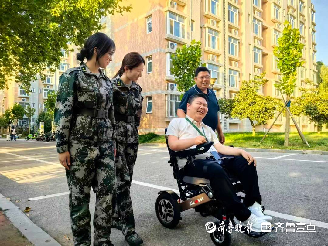 10月1日的济南,天气暖洋洋的。山东管理学院校园内,大一新生吴志腾坐在轮椅上。身后,妈妈牵着妹妹,爸爸稳稳握住轮椅推手,肩上还背着行李。一家四口就这样在学生潮中缓缓前行,汇入到国庆返乡的人流中。
