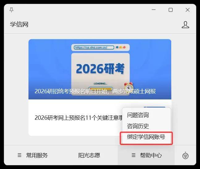方法2. 在“帮助中心-绑定学信网账号”菜单栏里,点击进入绑定页面,如下图: