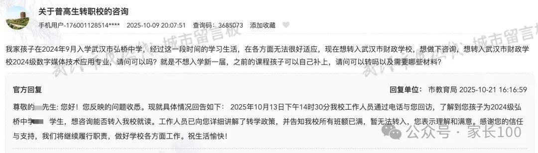 这位家长的孩子去年9月入学武汉市弘桥中学,经过这一年的学习生活,在各方面都无法很好适应,现在想转入武汉市财政学校。