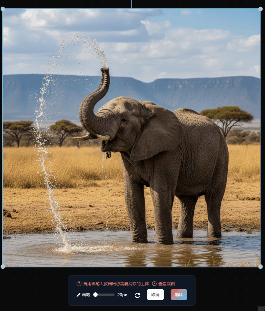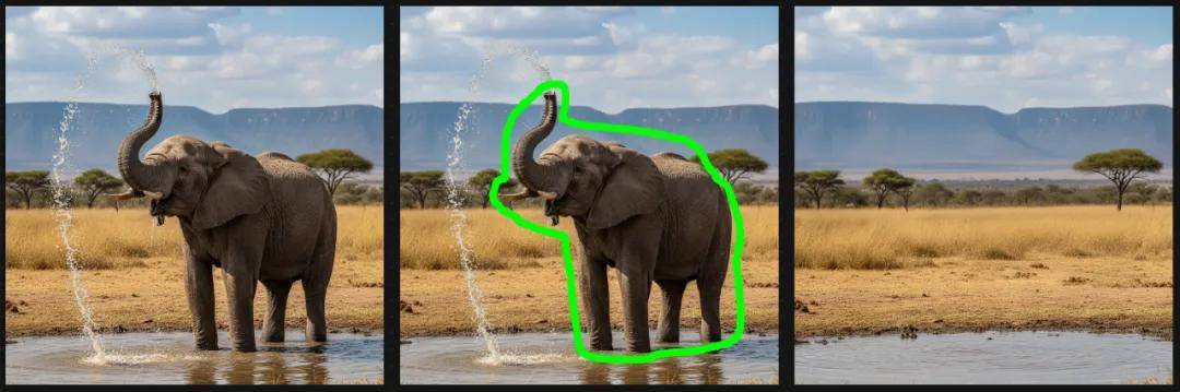 就像上图中,我只圈出了大象,并没有特意去圈大象喷出的水。但AI会根据真实场景的逻辑,自动把"大象消失后,水也不应该存在"这件事考虑进去,一并消除干净。