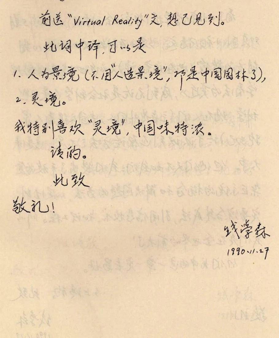 1990年11月27日,钱学森在信中将VR翻译为“灵境”。图片来源:钱学森图书馆