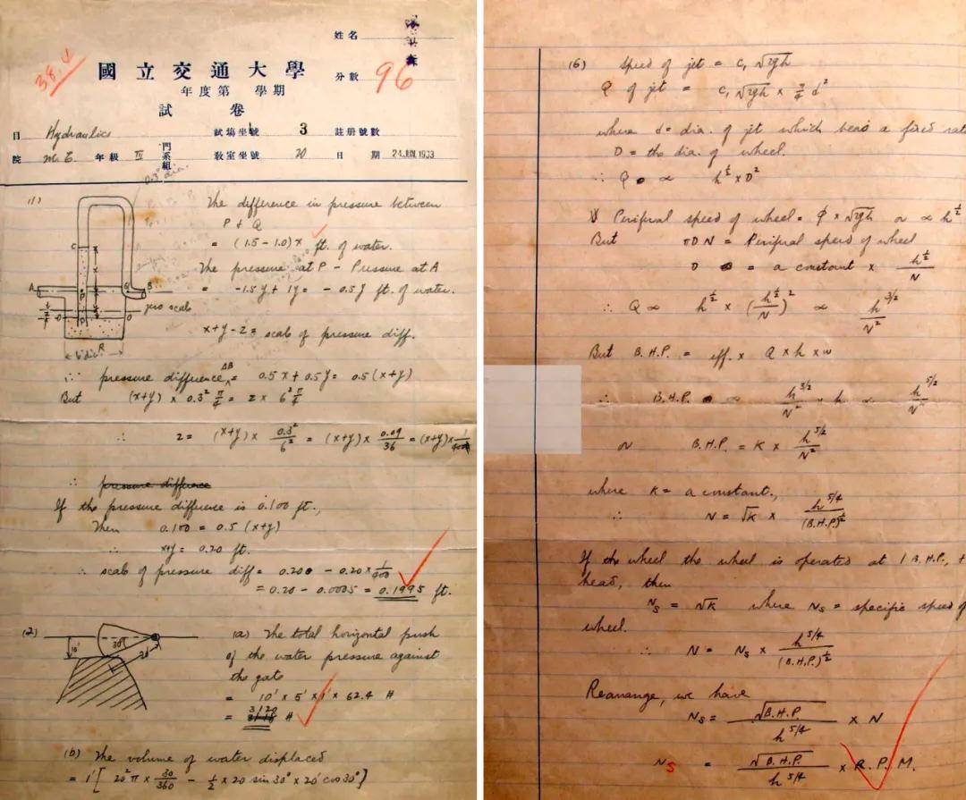 这份试卷卷首时间为1933年6月,课程是水力学,考生是钱学森。这次考试难度很大,而钱学森6道题全部解答正确,只在最后一题,公式推导中“Ns”漏写了一个“s”,被扣去4分。