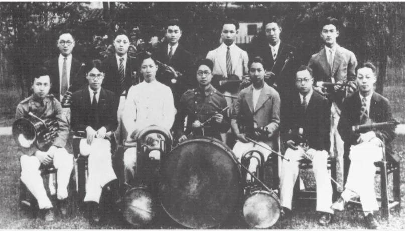 钱学森(前左一)在交大铜管乐队合影。