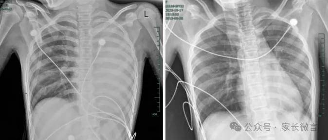 治疗前后影响对比,左肺从“白肺”到正常状态。